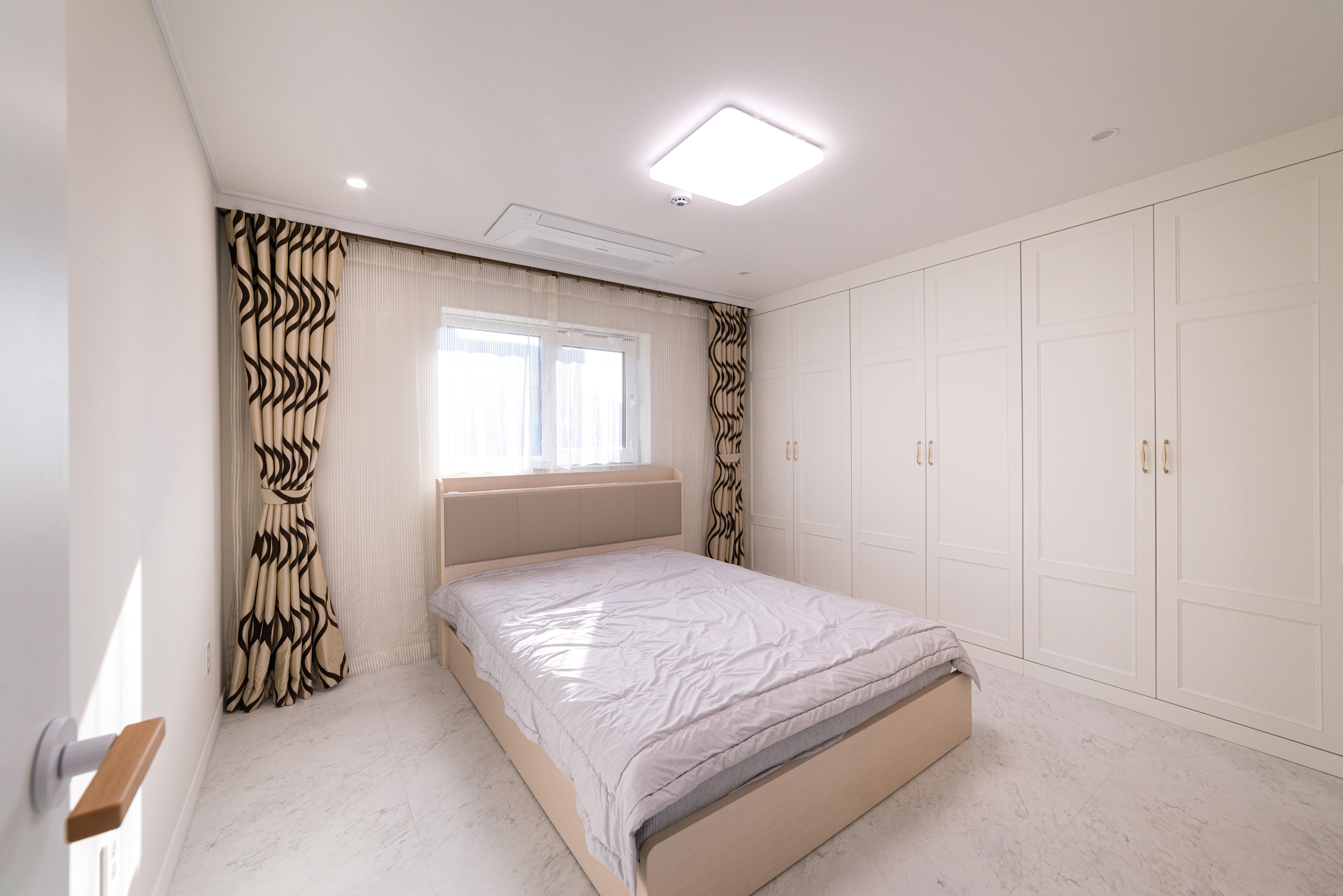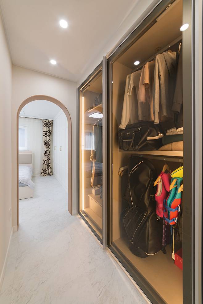 안방은 화이트 색상을 유지하며, 차분하고 따뜻한 톤 가구를 조화롭게 어우러지도록 했다. 드레스룸에 연결되는 오픈공간은 아치형 개구부를 두어 포인트를 줬다.