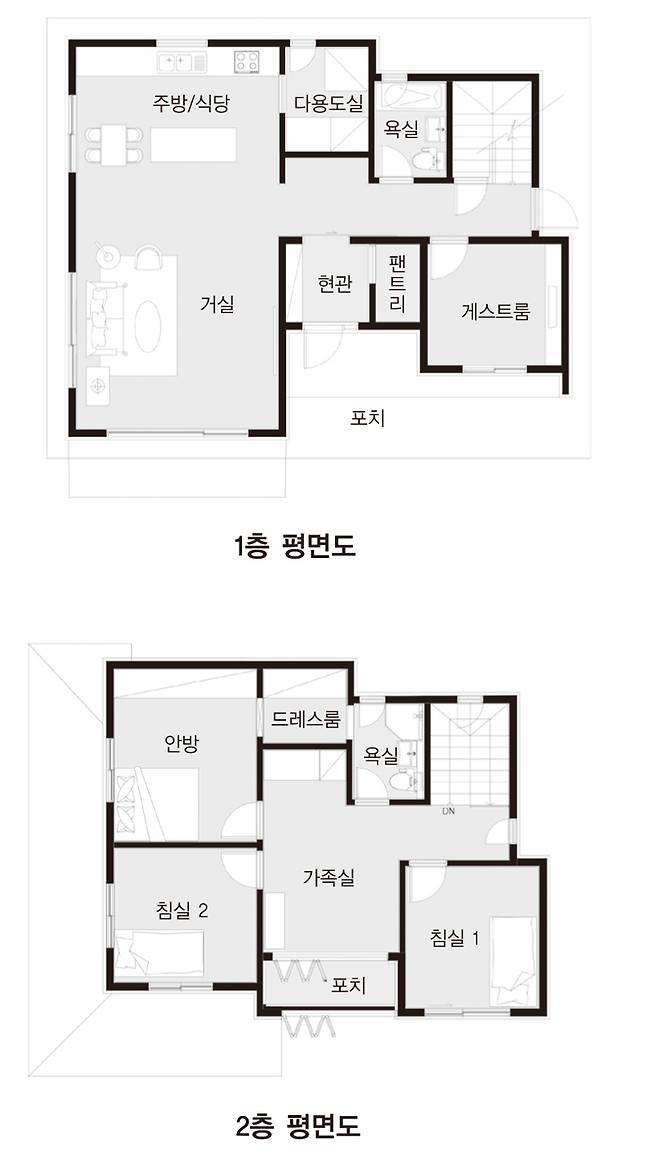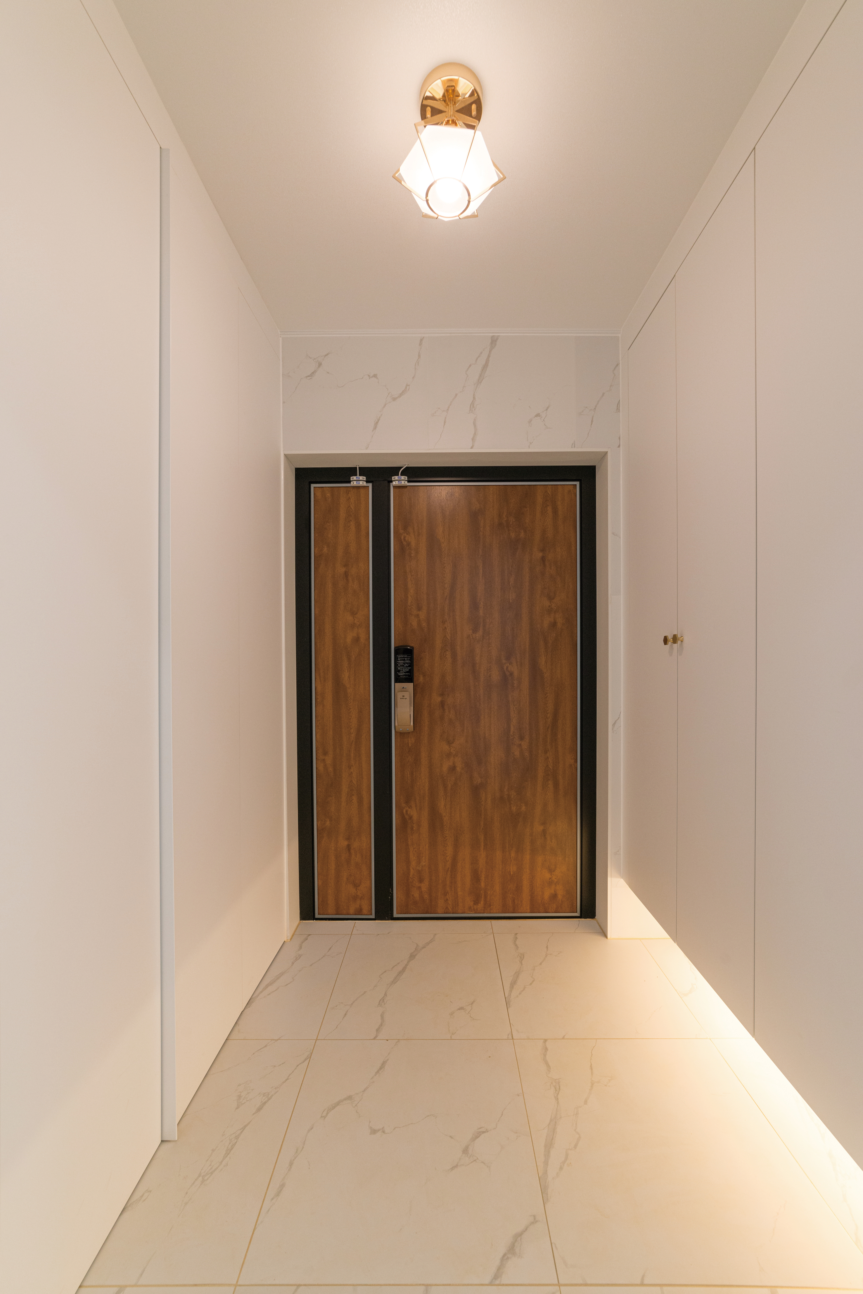 한쪽 면을 가득 채운 신발장과 펜트리를 활용해 수납공간을 확보했고, 화이트 가구로 채워진 공간은 깔끔한 인상을 주고 있다. 복도는 현관에서부터 확장된 느낌이 들 수 있도록 미닫이문을 적용해 연출했다.