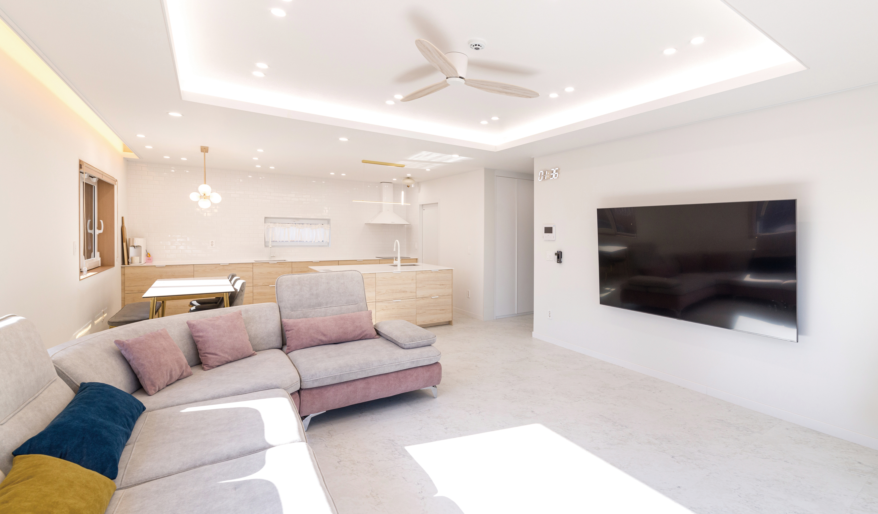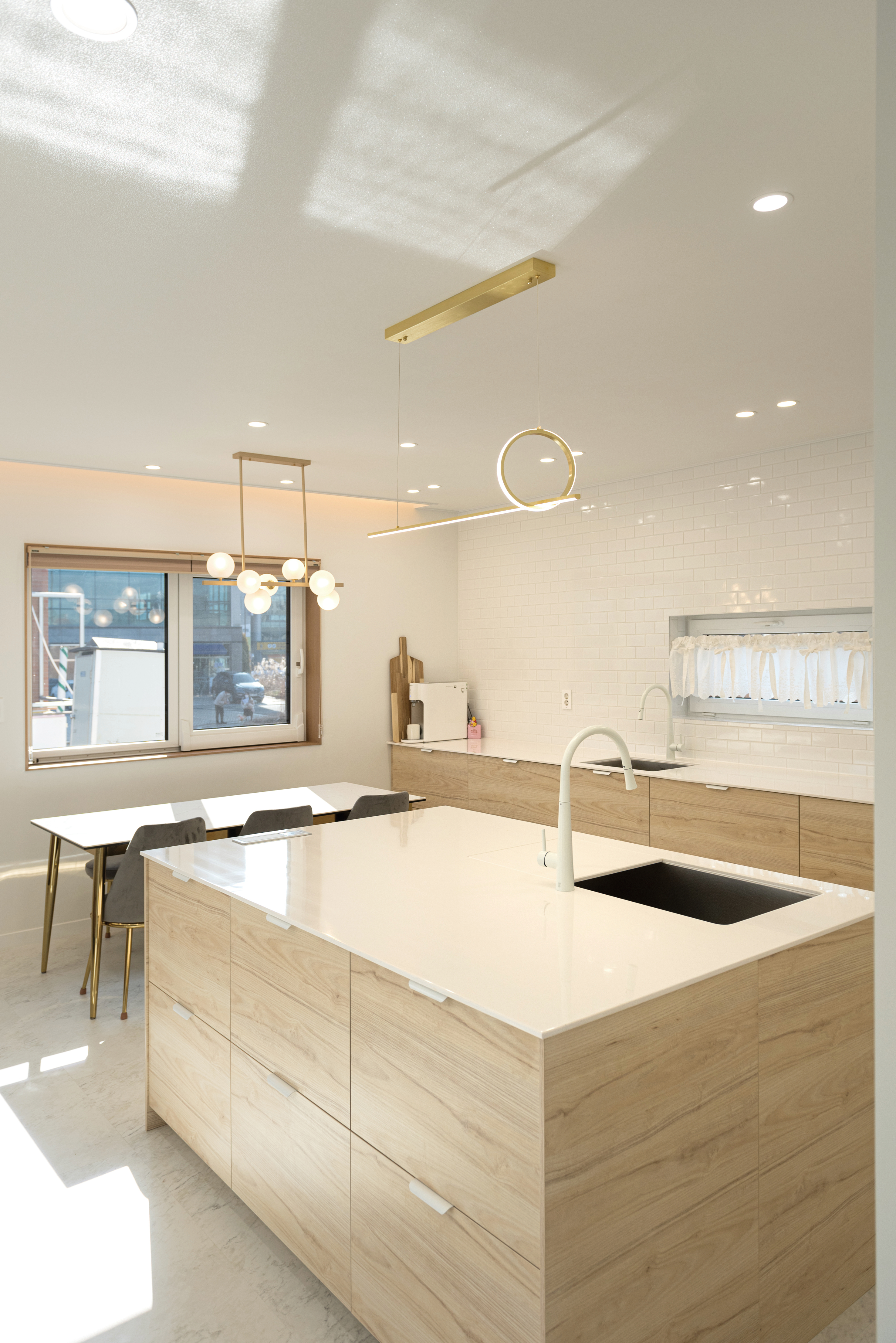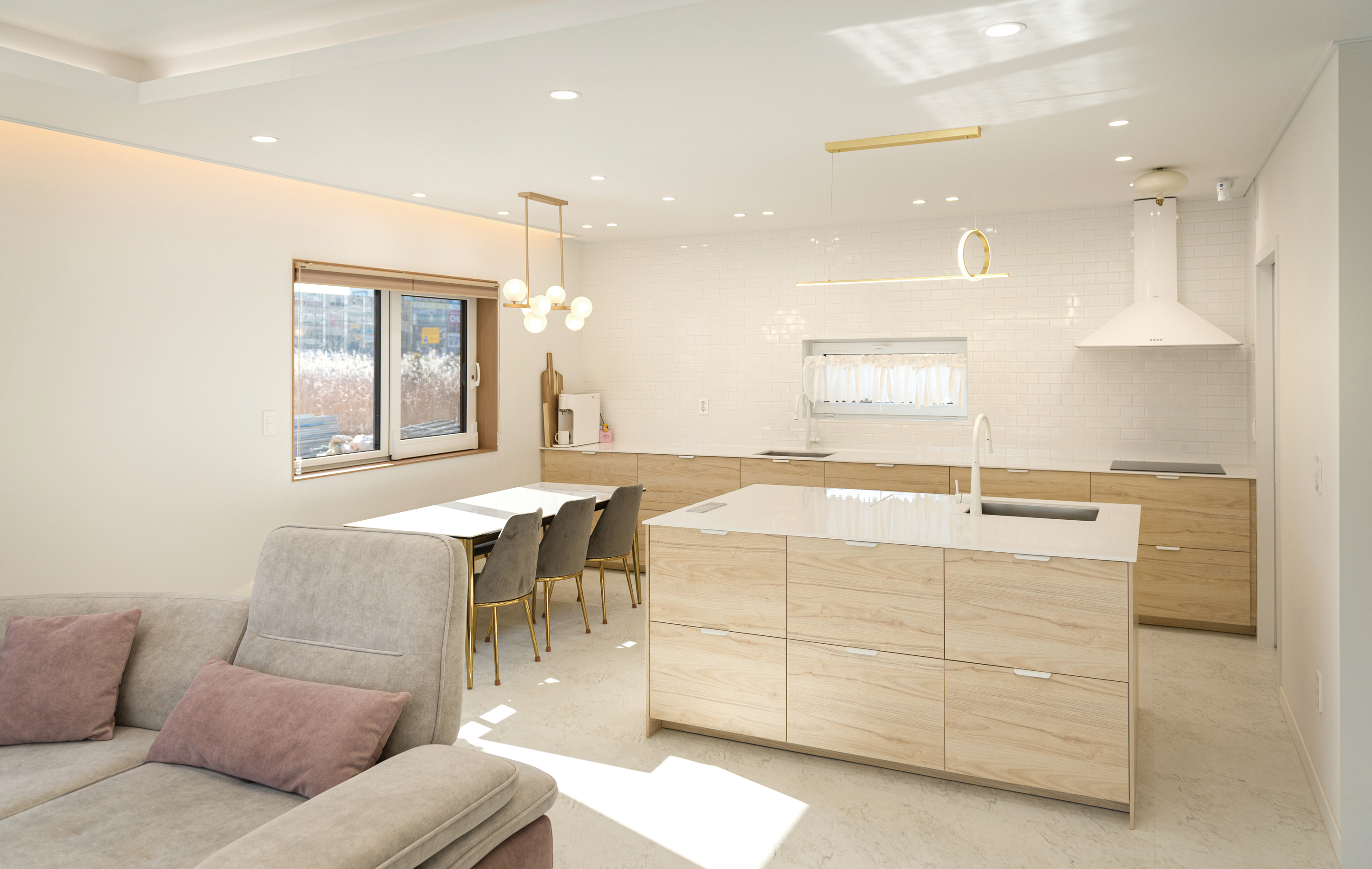 거실과 자연스럽게 연결되어 있는 주방과 식당은 소파로 공간을 분리시켰다. 우드 컬러 가구와 화이트 타일을 매치했고, 거실과 주방 창호의 틀을 우드로 마감해 부드럽게 조화시켰다. 상부장을 없애 개방감을 확보하고, 아일랜드 싱크대를 활용해 부족한 수납을 보완했다. 따뜻한 톤 바닥 타일은 분위기를 더욱 아늑하게 해준다. 천장 금색 조명을 일정하게 설치해 통일된 느낌이 들 수 있도록 했다