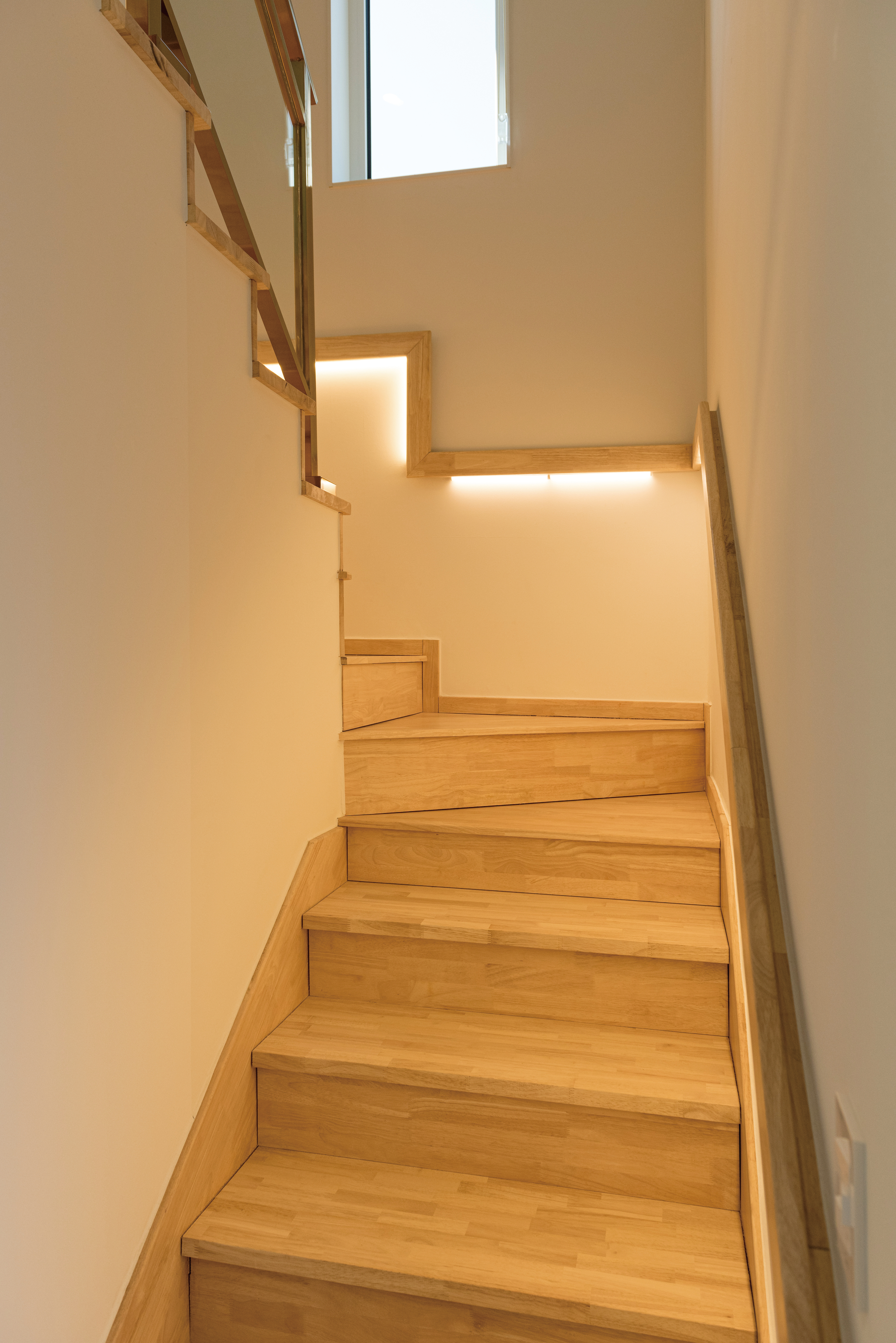2층으로 진입하는 계단 공간은 답답하지 않도록 금속 프레임 유리 난간을 설치했다. 이를 활용해 은은한 간접조명 효과를 줬다.