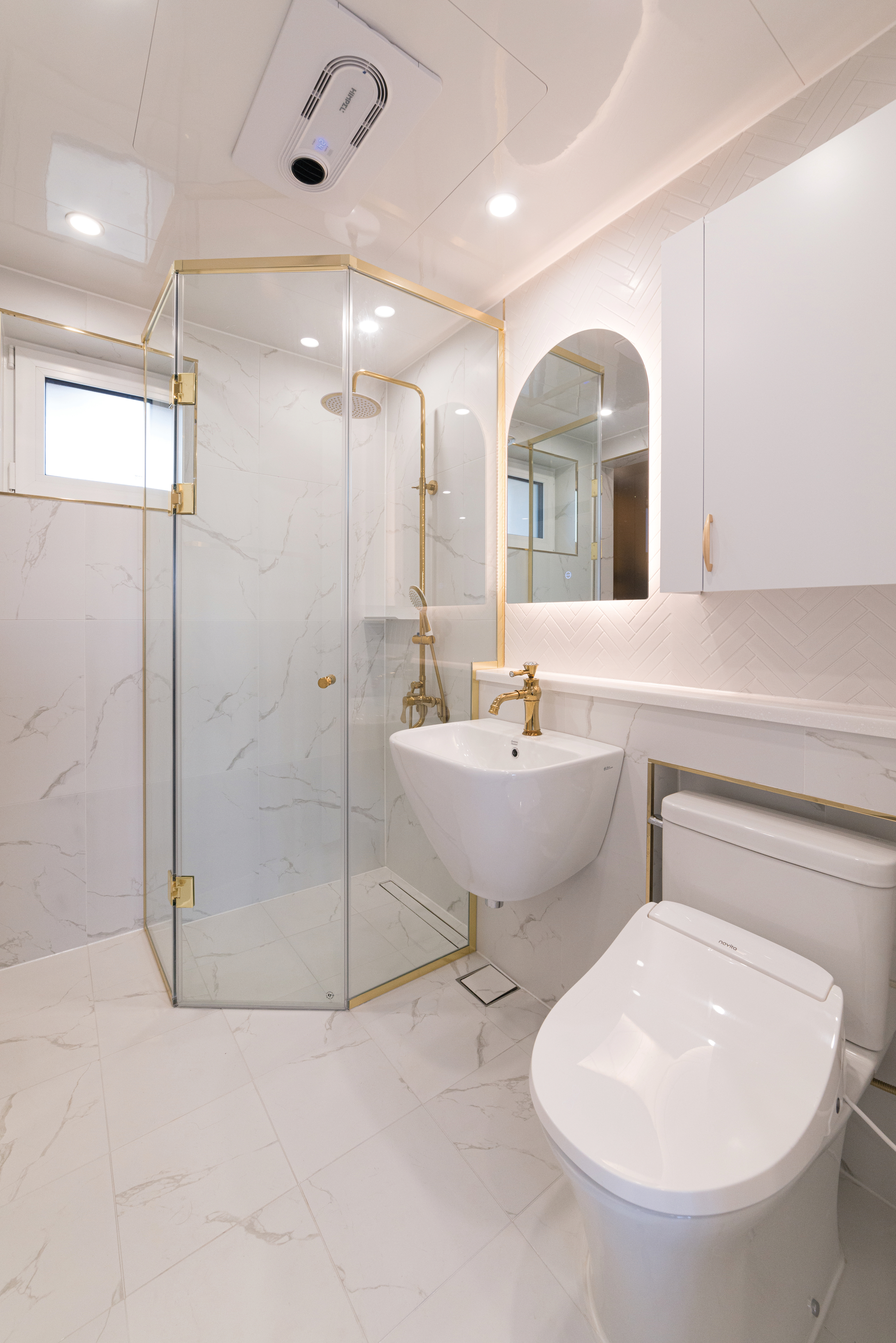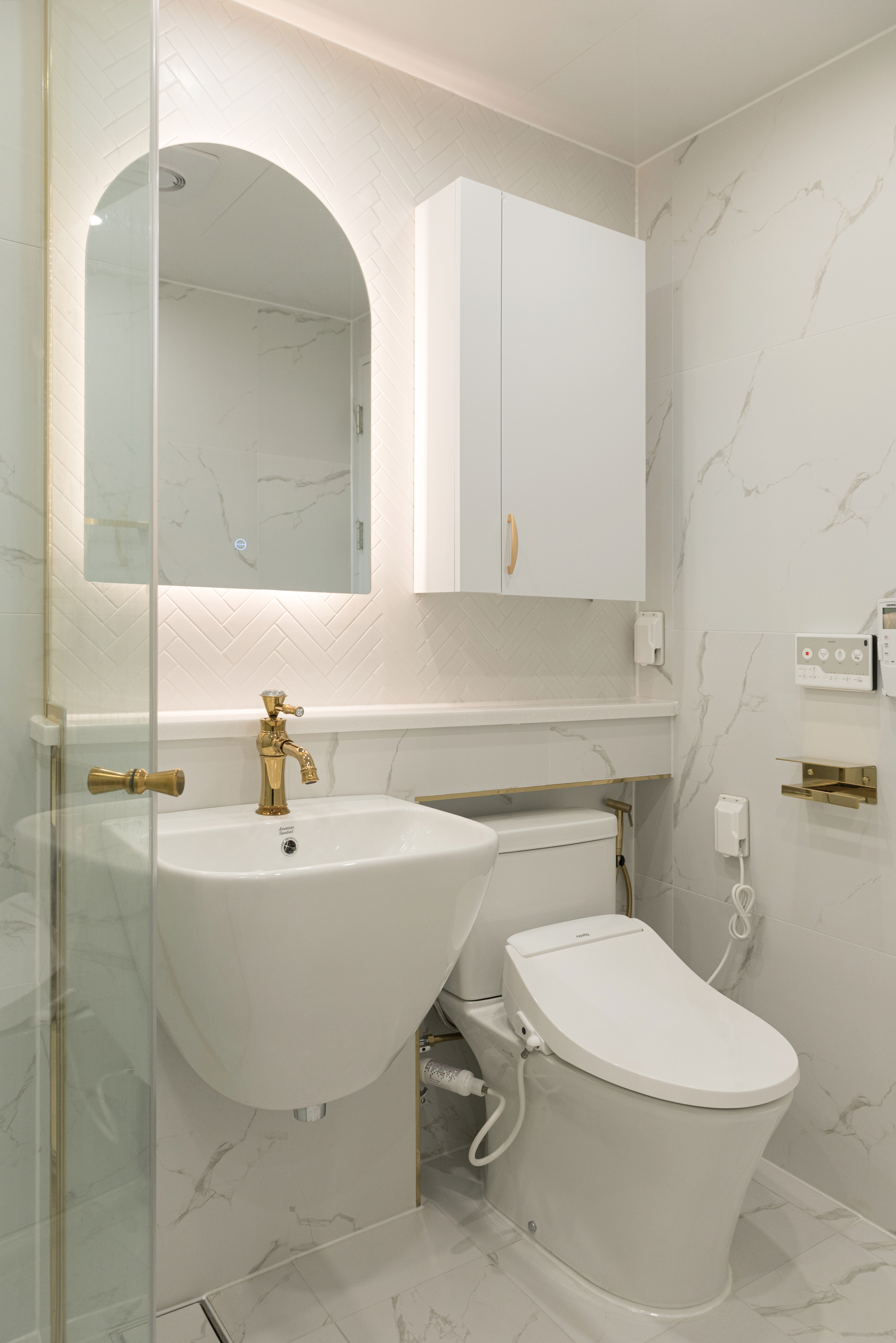 벽바닥 타일을 통일시켜 넓어 보이도록 연출했다. 전체적으로 금색 포인트를 주었으며, 유리 샤워부스를 적용해 개방적인 느낌을 줬다.
