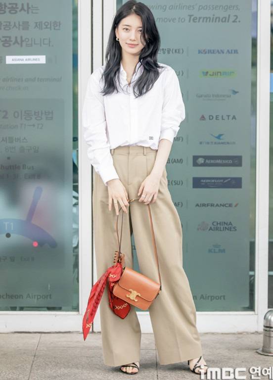 최근 수지는 화이트 셔츠에 셀린느 크로스백, 그리고 린넨 와이드 팬츠로 ‘꾸안꾸 공항룩’의 정석을 보여줬어요