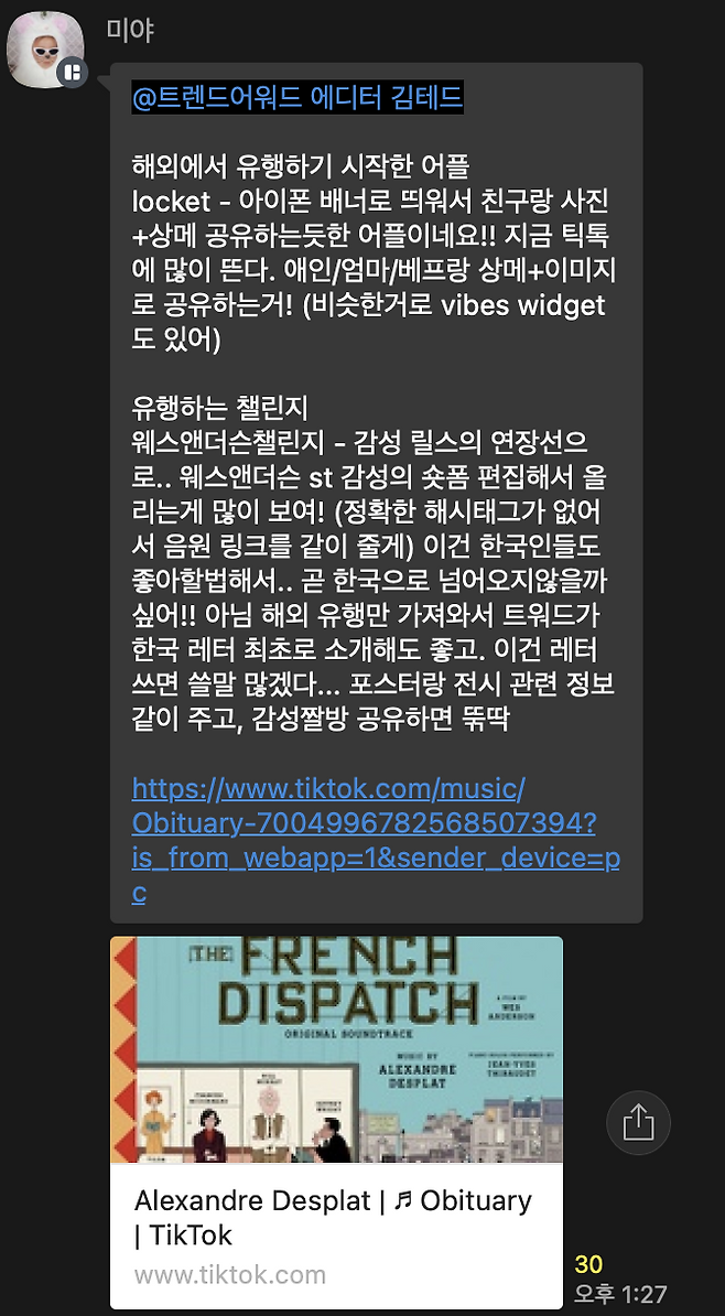 오늘은 트렌드 서치 그룹의 미야가 제보를 해줬다. (거의 레터 기획까지 해준 것은 안 비밀)