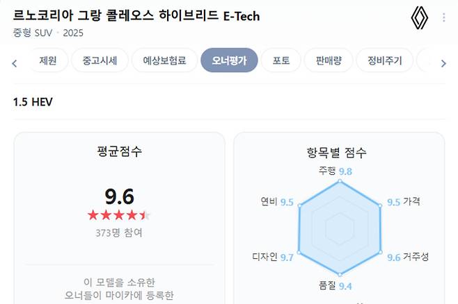실제 차주들의 평가를 기반으로 차량 만족도 점수를 공개하는 ‘네이버 마이카 오너평가’에 따르면 르노코리아 그랑 콜레오스 하이브리드 E-Tech의 오너평가 점수는 9.6점이다.