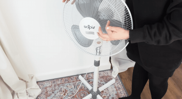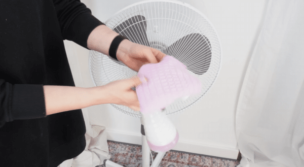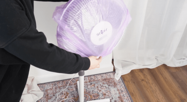 선풍기 머리 전체를 비닐로 감싸 입구를 테이프 등으로 고정한다.