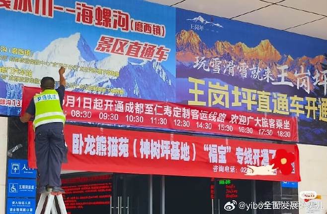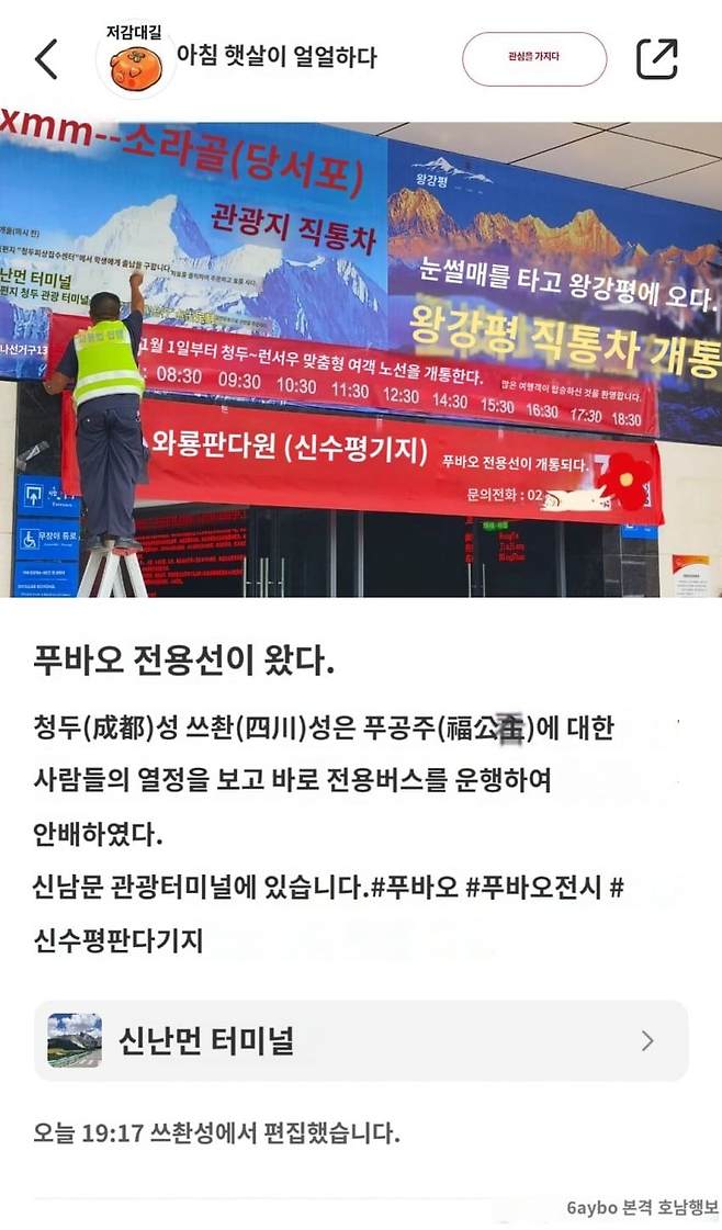 화제가 된 사진은 청두 시내 근처의 신남문(新南门) 터미널에 새 노선이 운행된다고 알리는 모습으로 보입니다. 홍보 현수막에는 대놓고 '푸바오'라는 글자가 적혀 있었습니다.