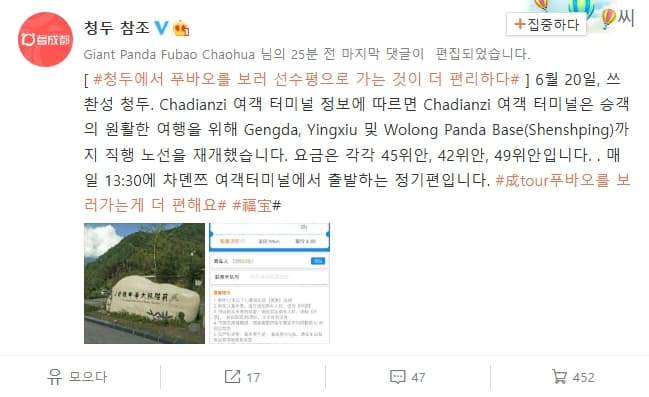 신남문 터미널뿐만 아니라 청두의 차점자(茶店子) 터미널에서도 매일 선수핑 기지 직행 노선을 만들었다고 하네요. 푸바오의 영향력이 얼마나 큰지 알 수 있는데요.