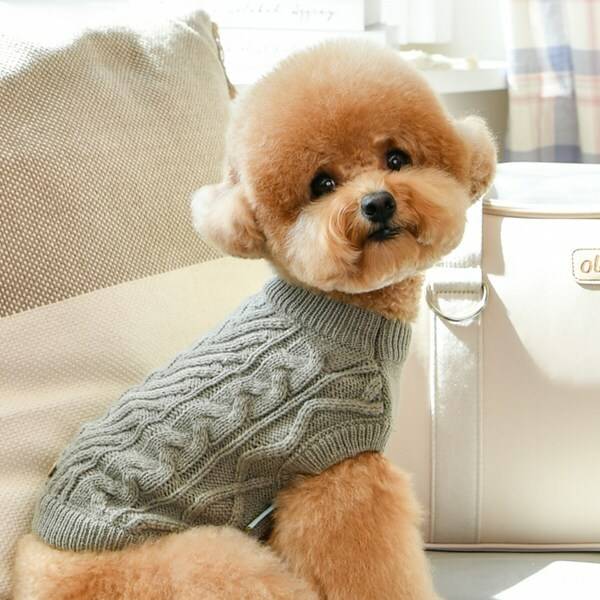 위 제품 사진에서 볼 수 있듯, 갈색 강아지와 잘 어울리는 따뜻한 색감의 회색 니트 조끼입니다. 꽈배기 니트로 고급스러워 보여요. 민소매라 활동성도 좋답니다.