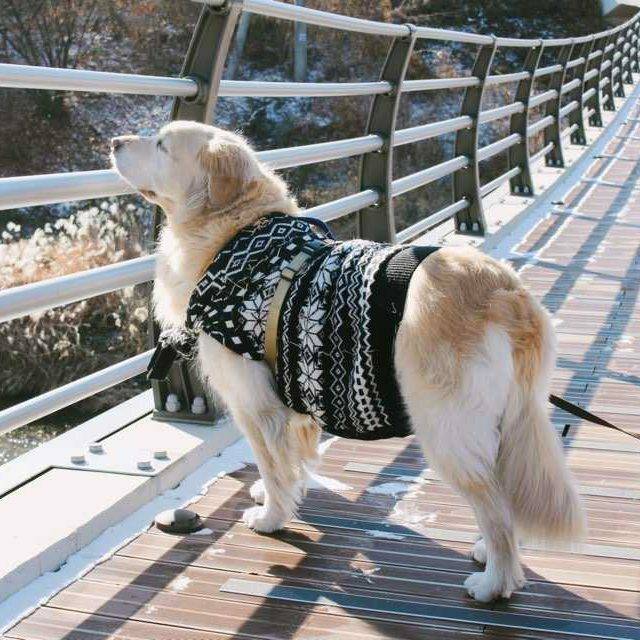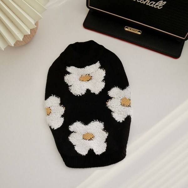 짙은 갈색 털의 강아지에게 잘 어울리는 검은색 니트로, 쌀쌀한 날 입히기 좋아요. 퀄리티 좋은 탄탄한 니트랍니다. 귀여운 플라워 패턴 포인트가 있어서 사진 찍기에도 좋아요.