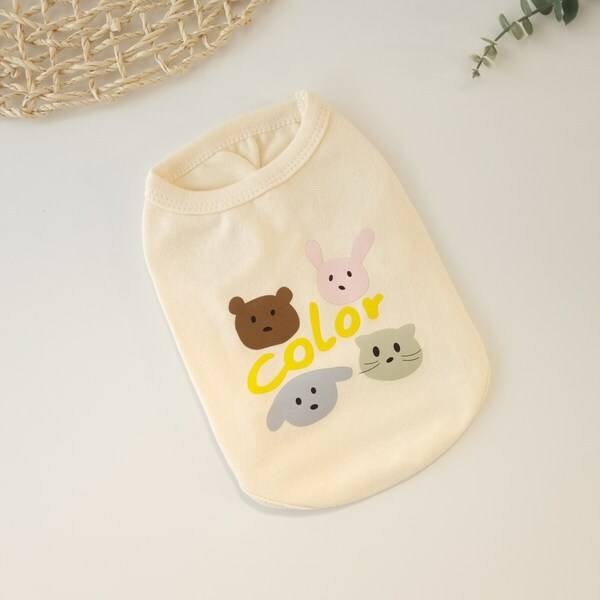 아이보리색 강아지 민소매 티셔츠입니다. 순면으로 부드럽고, 사계절 내내 입히기 좋아요. 등에 동물 친구들 그림이 그려져 있어 귀엽답니다.