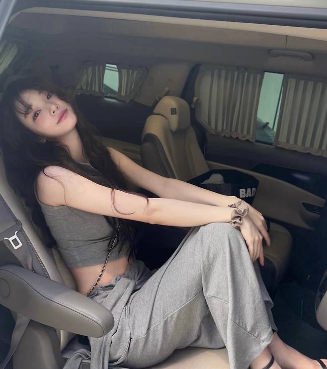 반면, 차 안에서 찍은 그레이 투피스 룩은 완전히 다른 결의 매력.
