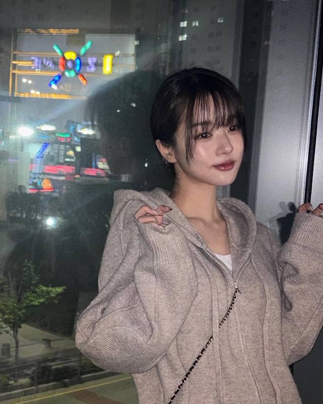 톤온톤 컬러감이 얼굴을 더 말갛게 밝혀주고, 밤빛 조명 속에서도 또렷한 실루엣이 시선을 끌어요.