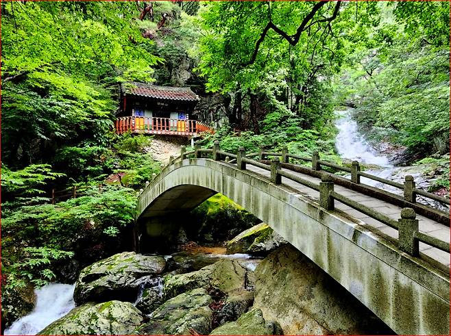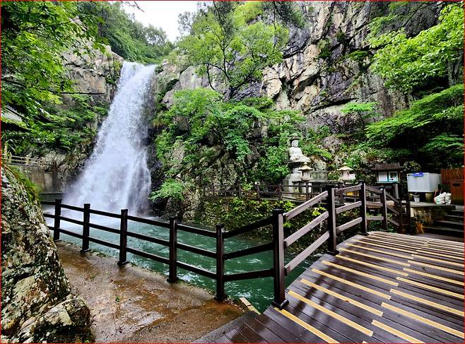깎아 세운 듯한 바위 절벽 위에서 떨어지는 물줄기와 주변 숲이 어우러진 풍광은 형언하기 어려울 만큼 아름답습니다. 여름철에는 특히 청량한 기운을 전해주어, 땀을 흘리며 오르던 등산객들에게 큰 위안을 줍니다.