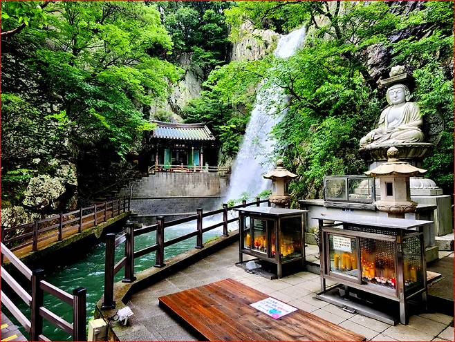 깎아 세운 듯한 바위 절벽 위에서 떨어지는 물줄기와 주변 숲이 어우러진 풍광은 형언하기 어려울 만큼 아름답습니다. 여름철에는 특히 청량한 기운을 전해주어, 땀을 흘리며 오르던 등산객들에게 큰 위안을 줍니다.