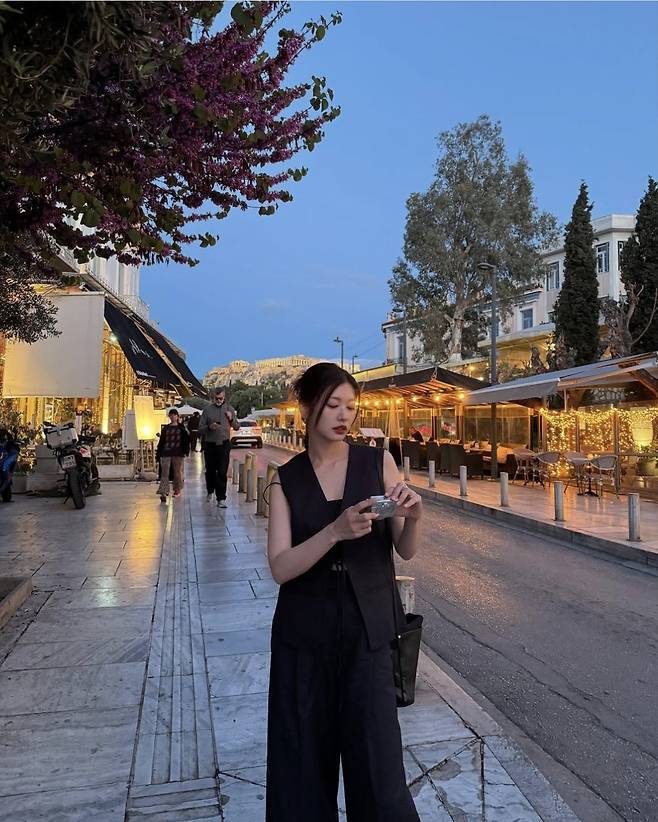어깨라인이 강조된 민소매 베스트와 하이웨이스트 와이드 팬츠의 조합은 특유의 슬림한 실루엣을 더욱 또렷하게 부각했습니다.