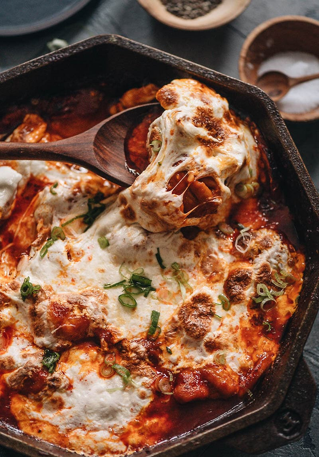 3. 모든 재료가 익으면 닭고기를 팬 중앙으로 모으고, 주변에 모차렐라치즈를 듬뿍 뿌려주세요. 뚜껑을 덮고 약불로 3분 정도, 치즈가 녹을 때까지 익히면 완성입니다.