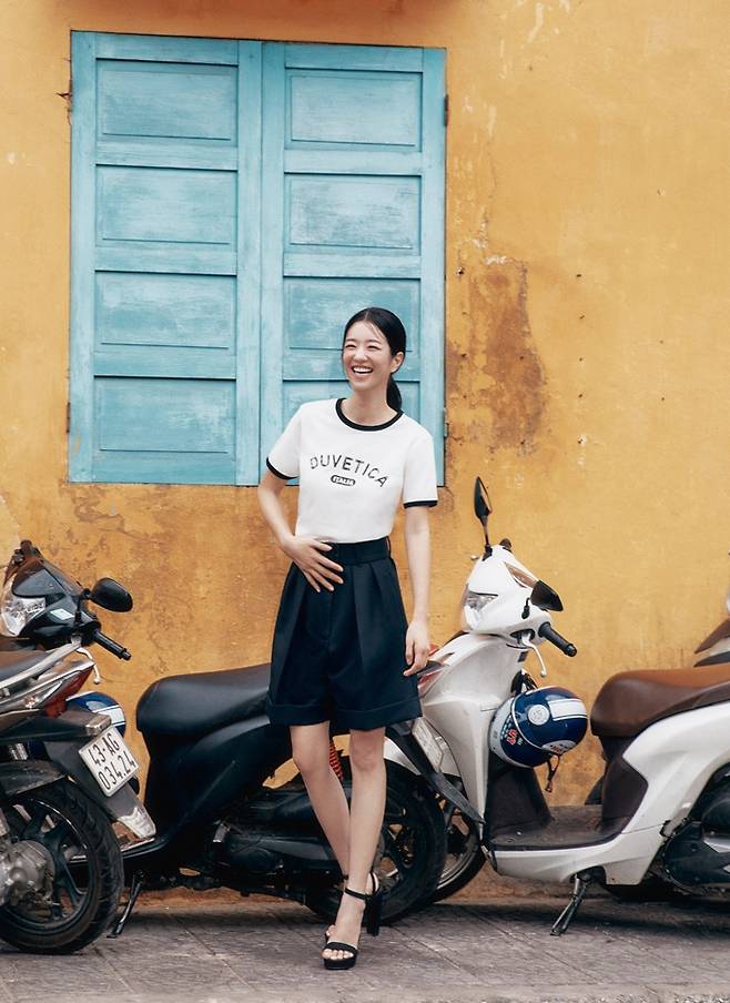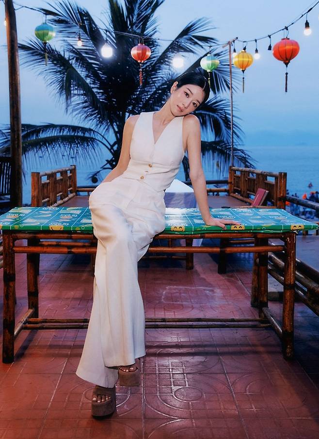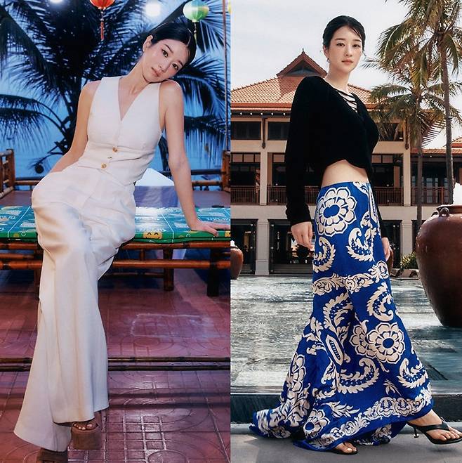 또 보디라인이 그대로 드러나는 베이지 컬러의 시폰 드레스, 화이트 컬러의 브이넥 베스트와 와이드 팬츠 등 시크하면서도 우아한 모습으로 다낭의 이국적인 풍경과 어우러진 모습을 보이며 마치 프랑스 영화 속 한 장면처럼 아름답고 감성적인 분위기를 자아냈다.