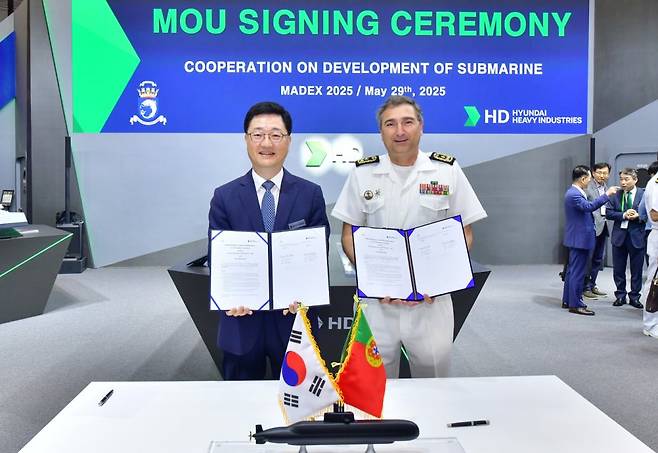 지난 5월 30일 부산 벡스코에서 열린 '국제해양방위산업전(MADEX) 2025'에서 HD현대중공업과 포르투갈 해군이 전략적 파트너십을 위한 업무협약을 체결했습니다.