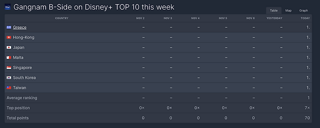 전 세계 OTT 플랫폼 내 콘텐츠 시청 순위 집계 사이트인 FlixPatrol(플릭스패트롤)에 따르면 <강남 비-사이드>는 지난 11월 6일(수) 1, 2화 공개 이후 한국을 비롯해 그리스, 홍콩, 일본, 몰타, 싱가폴, 대만 7개국에서 디즈니+ TV쇼 부문 1위를 차지하며 글로벌 흥행 저력을 과시했다.