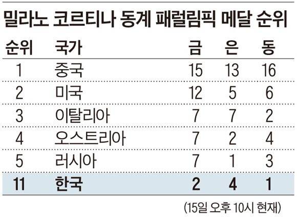 한국은 1992년 동계 패럴림픽에 처음 출전해 2002년 첫 메달(은)을 따냈다. 2018 평창 동계 패럴림픽 금1·동2(종합 16위)가 이번 대회 전까지 한국의 최고 성적이었다. 2022 베이징에서 노메달에 그친 한국은 우수 선수 집중 육성과 국내외 대회 출전 기회 확대 등에 힘쓰며 이번 대회를 준비해 성과를 거뒀다.
