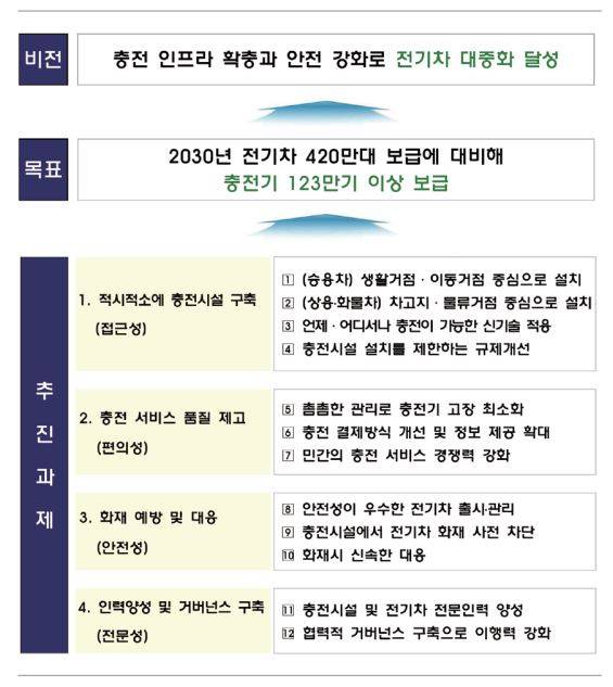 전기차 충전 인프라 확충과 안전 강화로 전기차 대중화를 달성한다는 비전하에 2030년까지 전기차 420만대 보급과 충전기 123만기 이상을 보급하는 것을 목표로 설정하였다.