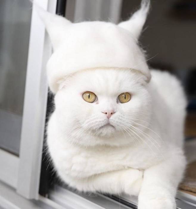 "모자를 쓴 채 살짝 심드렁한 표정의 냥이.