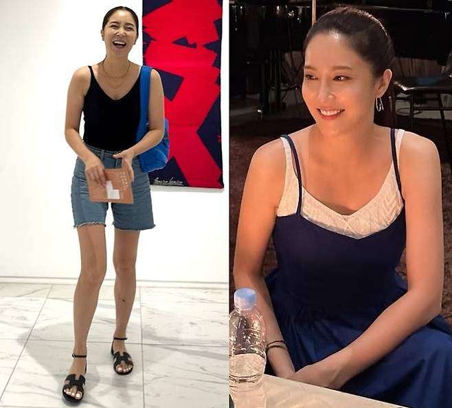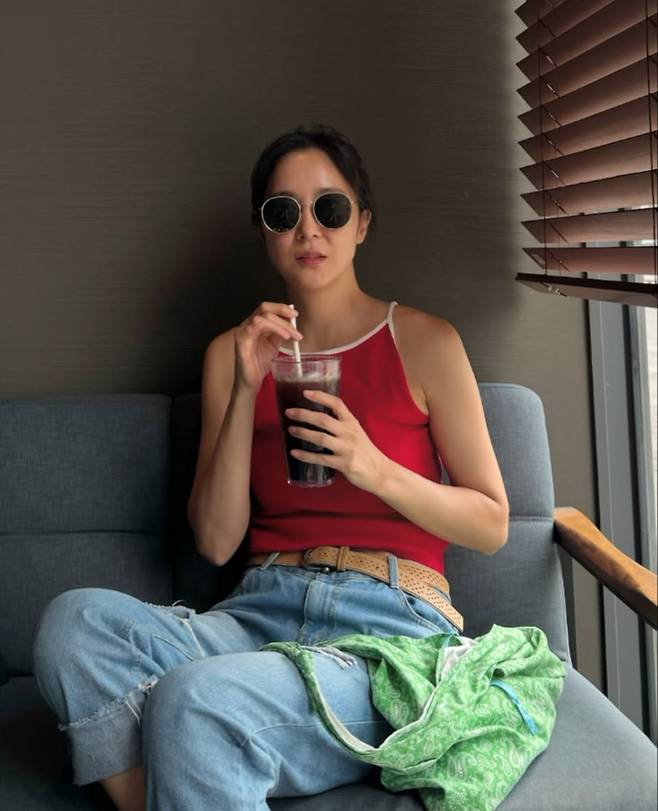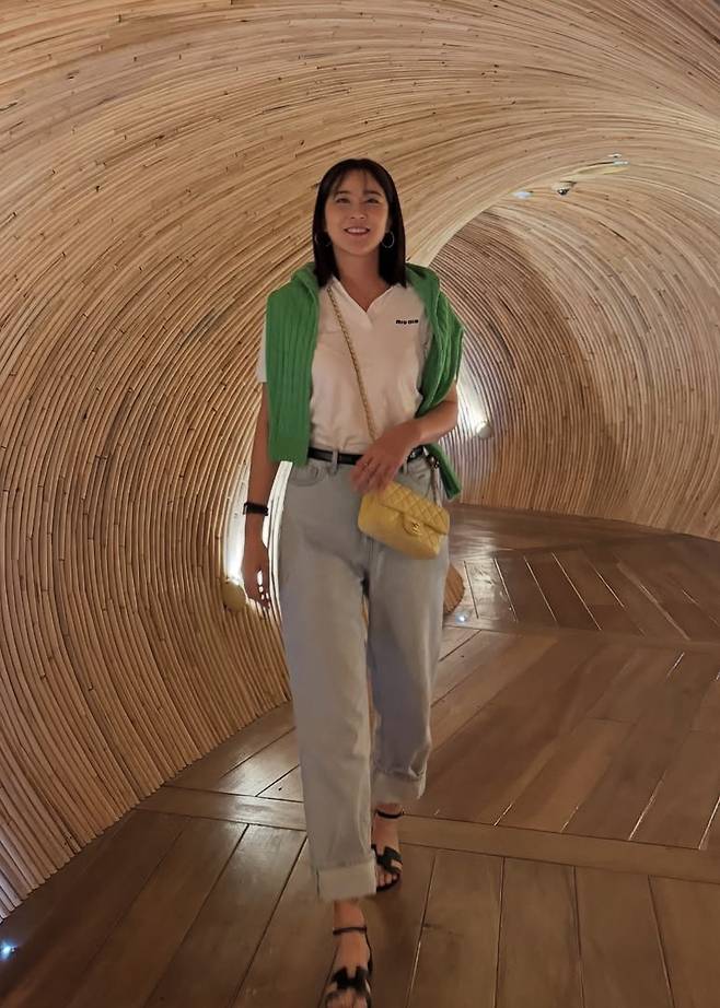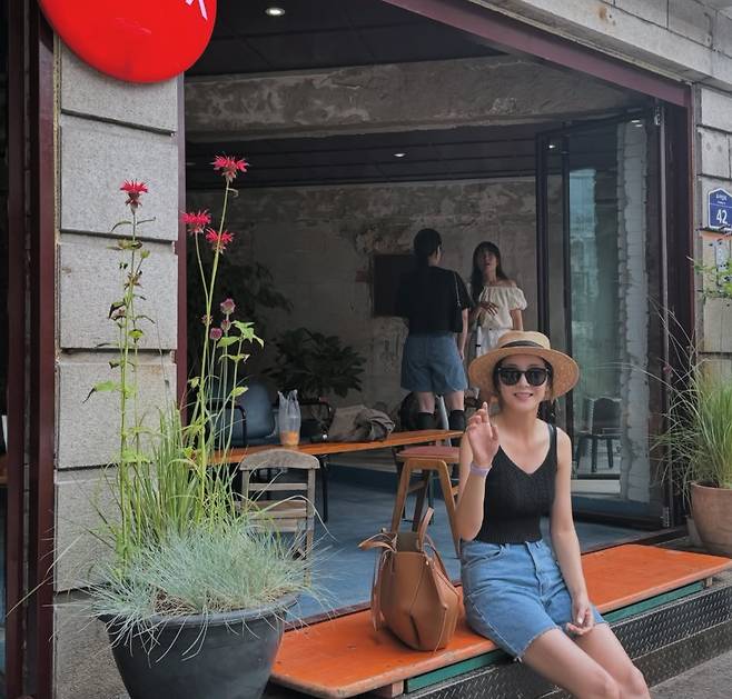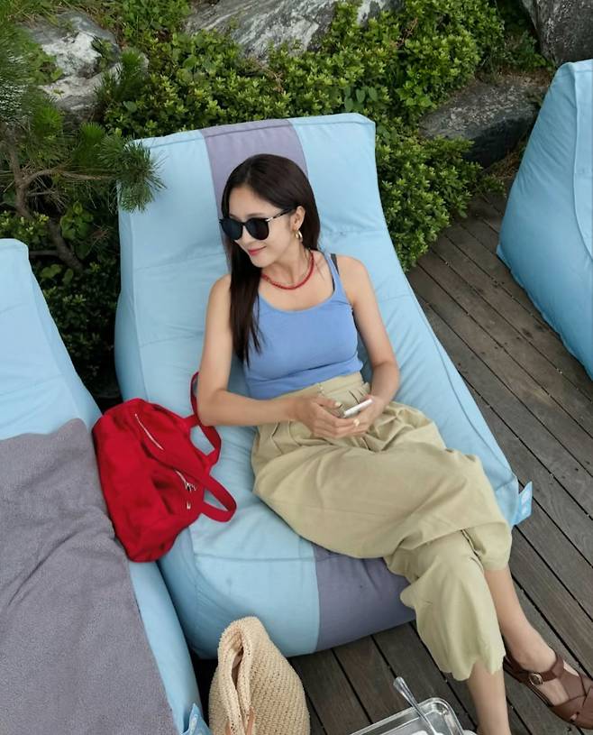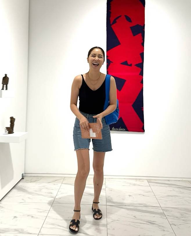 미니멀한 블랙 샌들과 블루 숄더백으로 포인트를 주며 활동성과 발랄함을 강조했습니다.