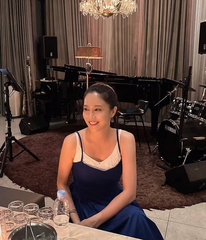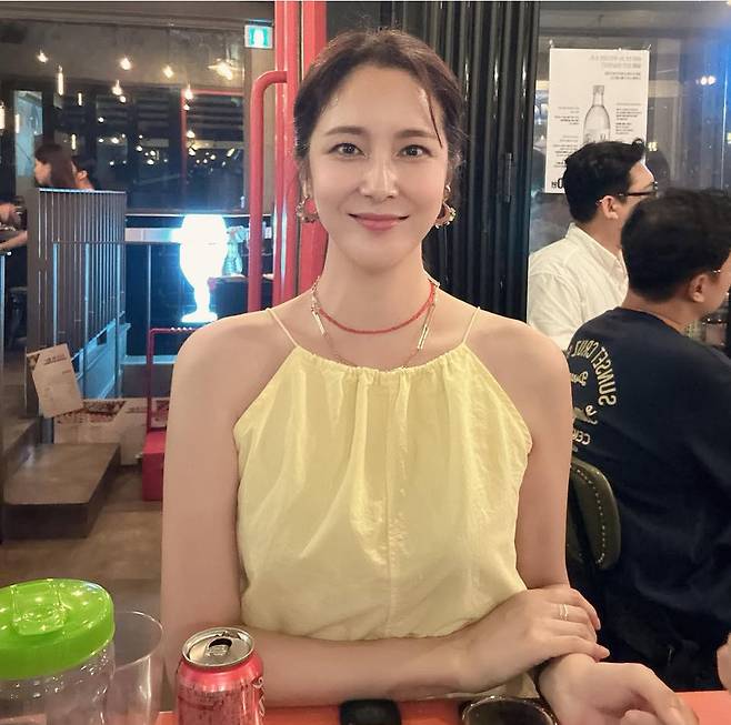 얇은 스트랩 디자인이 쇄골 라인을 드러내며 우아함을 더했고, 헤어는 올림머리로 정돈해 차분한 이미지를 부각했습니다.