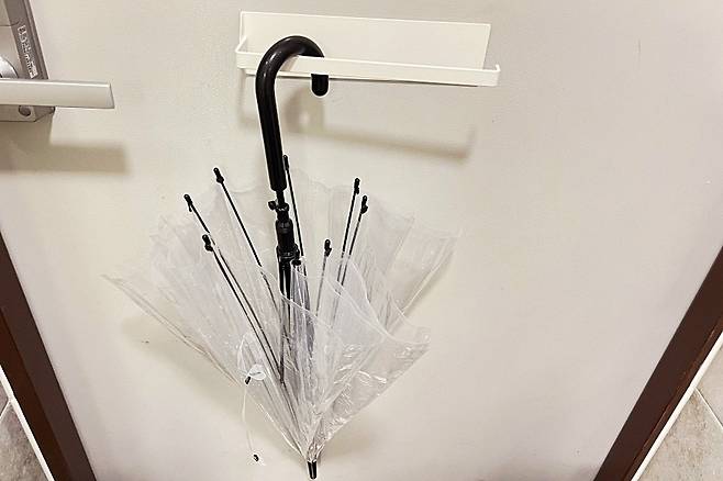 비 온 날은 우산 현관문에 두면 쓰레기지 일쑤인데 이렇게 걸어두니 쓰러질 염려도 없고 물기도 금방 말라요. 다이소에 보이면 꼭 한번 사용해 보세요(내돈내산입니다)