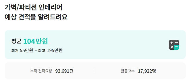 숨고 내에서 거래되는 가벽/파티션 인테리어 평균 비용은 건당 104만 원입니다. 최저 비용은 55만 원, 최고 비용은 195만 원으로 책정되어 있어요.