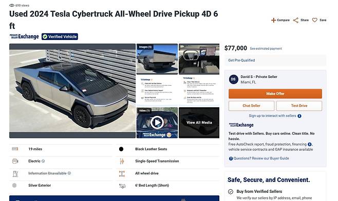 설명란을 보면 이 차량은 플로리다주 마이애미의 개인 판매자(David S.)가 등록한 사이버트럭으로 주행거리가 19마일(약 31km)에 불과하다. 가격 게재를 실수한 게 아닌 이상, 이는 여태까지 등장했던 중고 사이버트럭 중 가장 저렴한 가격이다.