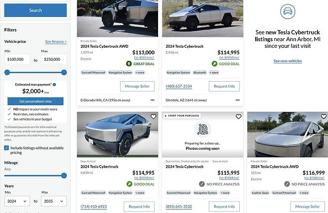 또 다른 중고차 판매 사이트 ‘Autotrader’에 등록된 새로운 사이버트럭 매물은 $77,000(약 1억 513만 원)에 불과한 가격으로 관심을 끌었다. 사이버트럭 신차보다 더 저렴한 것이다.