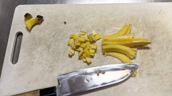 바나나껍질을 잘게 썰어 페트병 바닥에 넣습니다. 껍질 표면적이 넓을수록 향이 잘 퍼집니다.