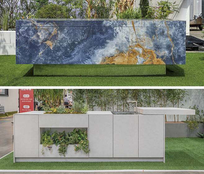 위와 같은 건축의 마감재와 가구의 마감재가 더 이상 다르지 않다는 것은 야외용 키친에서도 확인할 수 있다. 실외에서 사용하던 마감재가 가구에도 구현될 수 있다는 것은 ‘가구가 비를 피하지 않아도 된다’는 엉뚱한 상상을 가능하게 한다. 2024년도 밀라노 가구 박람회, 그리고 같은 해 정원박람회 등에서 야외용 가구는 주목받을 만한 장르가 되었다. 아래 사진은 실내에 있음 직한 주방 아일랜드가 실외에 나오게 된 모습이다.