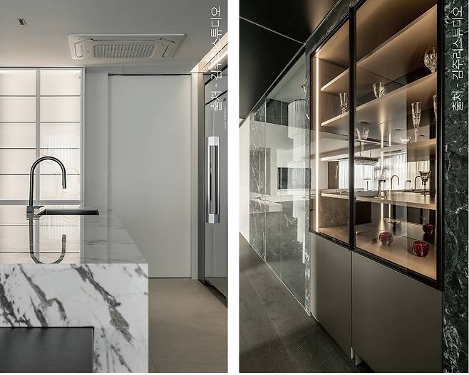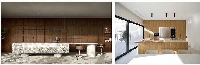 ⑥ 세라믹 및 대리석 : 기존에는 가구의 상판 정도로만 여겨오던 세라믹, 대리석 등이 최근에는 가구 도어의 소재로 주목받고 있다. 유럽의 전통 있는 브랜드에서도 매년 가구 박람회 시즌에 브랜드의 저력을 내보이기 위해 선보이는 것이 스톤 소재 도어다. 가공이 쉽지 않고 묵직하고 고급스러운 연출이 가능하다. 세라믹으로 가구의 도어를 만들기 시작하면서, 이제 정말 모든 소재를 가구에 사용하면 되겠다는 생각이 들었는데 그 이유는 세라믹이라는 것이 과거에는 건축물의 외장재에 사용하던 자재(박판 타일)이기 때문이다. 따라서 세라믹 또는 천연 대리석의 가구 도어 등의 스톤이 포인트가 되는 주방을 설계할 때 건물의 외장 디자인도 고려하면 실패하지 않는 디자인이 나온다. 특히 건물의 외관이 통창으로 보이는 현장에서 주방 아일랜드의 도어와 외장재의 콘셉트가 통일되어 보일 때는 큰 건축물의 오브제로 주방을 옮겨놓은 것 같은 느낌마저 자아낼 수가 있다.