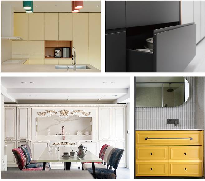 ③ 우레탄 도장 : 우리가 편히 ‘페인트’라 부르는 공법이다. 장점이 많고 고급스러운 마감이 가능하다. 우선 모서리에 ‘엣지’라는 추가 마감을 하지 않고, 뿌려서 마감해 이음새나 모서리가 매끈하다. 그리고 판재 자체를 성형할 수 있기에, ‘U’자, ‘J’자 등의 홈파기 손잡이가 가능하다. 또는 몰딩이나 따내기 등의 작업이 가능하므로 클래식, 빈티지, 루버, 원형 등의 개성 있는 도어 제작이 가능하다. 특히나 클래식한 현장은 가구만으로 완성되지 않고, 건축의 외관에서부터 실내 상부 몰딩과 벽면 장식 또는 천장의 모양과 방문조차 하나하나 디자인하여 한 방향으로 콘셉트를 바라보기 때문에 일체화된 디자인 설계가 가능하다. 깨끗하고 장식 없는 민자 도어를 선택한다면, 벽면과 같은 컬러로 조색할 수 있어 히든 가구 도어 등의 일체화된 디자인을 이룰 수 있다.