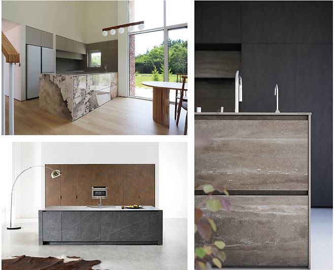 ⑥ 세라믹 및 대리석 : 기존에는 가구의 상판 정도로만 여겨오던 세라믹, 대리석 등이 최근에는 가구 도어의 소재로 주목받고 있다. 유럽의 전통 있는 브랜드에서도 매년 가구 박람회 시즌에 브랜드의 저력을 내보이기 위해 선보이는 것이 스톤 소재 도어다. 가공이 쉽지 않고 묵직하고 고급스러운 연출이 가능하다. 세라믹으로 가구의 도어를 만들기 시작하면서, 이제 정말 모든 소재를 가구에 사용하면 되겠다는 생각이 들었는데 그 이유는 세라믹이라는 것이 과거에는 건축물의 외장재에 사용하던 자재(박판 타일)이기 때문이다. 따라서 세라믹 또는 천연 대리석의 가구 도어 등의 스톤이 포인트가 되는 주방을 설계할 때 건물의 외장 디자인도 고려하면 실패하지 않는 디자인이 나온다. 특히 건물의 외관이 통창으로 보이는 현장에서 주방 아일랜드의 도어와 외장재의 콘셉트가 통일되어 보일 때는 큰 건축물의 오브제로 주방을 옮겨놓은 것 같은 느낌마저 자아낼 수가 있다.
