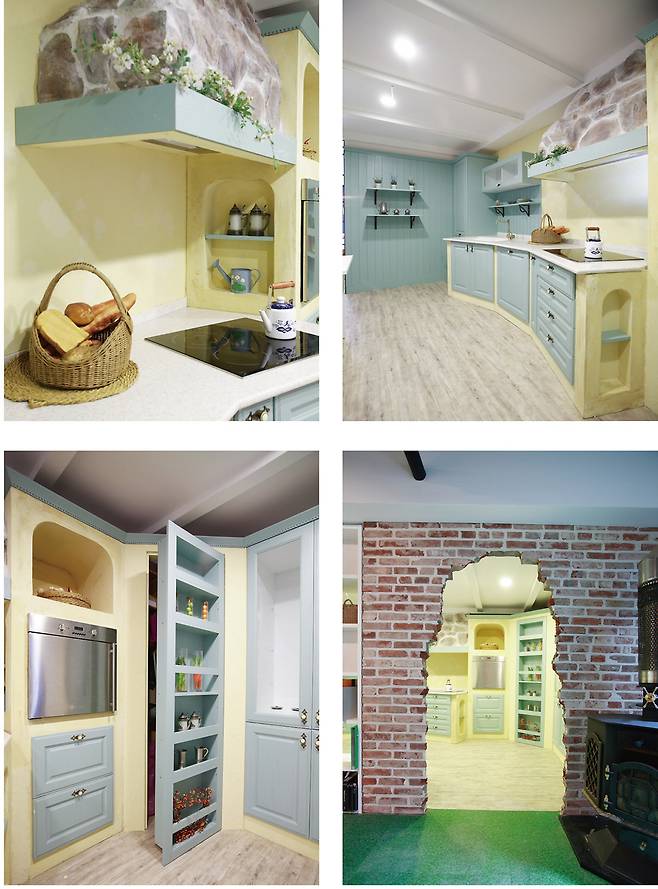 다음 현장 사진은 한동안 우노의 시그니처였던 ‘프로방스 주방’ 디자인이다. 벌써 10년이 넘은 사진이지만 지금 보아도 촌스럽지 않고 유행을 타지 않는 이유는 가장 건축적인 주방을 설계하기 위하여 애썼기 때문이다. 다음 현장에서 눈여겨볼 것은 몸통이 어디 있느냐 하는 것이다. 마치 집을 짓듯 가구를 건축물 안에 녹여 설계하고 벽면을 도장하듯 노란색 페인트로 마감하였다. 첫 번째 사진에서의 벽돌 마감은 건물 외장에서 주는 프로방스의 느낌을 연출한다. 팬트리장의 가구가 별도로 있는 것이 아니라, 방처럼 팬트리를 연출하고 히든 도어로 재치 있게 감추는 디자인을 하였다.