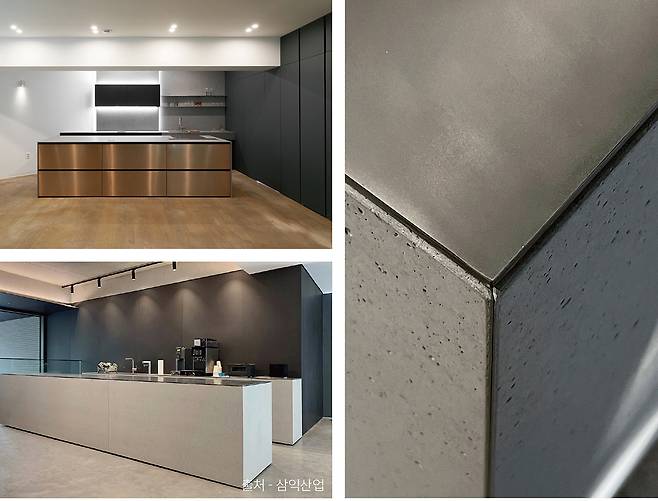⑦ 금속 또는 콘크리트 : 앞서 나온 도어 자재들이 지금까지 써오던 소재였다면, 최근의 가구 트랜드는 기존에 차갑다는 느낌 때문에 쓰지 않았던 재료를 활용하는 새로운 시도가 많아지고 있다. 그중 첫 번째는 금속 도어이다. 철판으로 디자인할 수도 있겠지만, 최근 우노 쇼룸에서는 발색 도장한 스테인리스 스틸 도어를 선보였다. 스테인리스 스틸로 만든 도어는 가공비에서는 조금 부담이 될 수 있겠지만, 내구도와 컬러에서 독보적인 개성을 가질 수 있다. 최근 유럽에서는 스테인리스 또는 철판 느낌이 나는 도장을 활용한 금속 도장 디자인이 여러 세트 선보여졌다. 두 번째 콘크리트 도어 마감재도 금속 도어와 같은 측면에서 거칠고 차가운 느낌 때문에 많이 쓰지는 않던 소재이지만, 기존의 소재들이 주지 못하는 현대적인 느낌을 자아낸다는 측면에서 여러 디자이너 또는 건축주들의 선호도를 높이고 있다. 금속 또는 콘크리트 도어 마감재가 시사하는 디자인의 콘셉트는 바로 ‘탈 생활성’이다. 아주 단정하고 현대적인 느낌의 건축물이 주는 인상을 실내로 들어와 훼손하지 않고, 마치 쇼룸이나 전시장에 있을 것만 같은 금속 덩어리 또는 콘크리트 덩어리 같은 느낌의 주방을 연출하는 것이다. 오래전 콘크리트 가구를 만들었던 적이 있는데, 그때는 현장에서 몰탈을 치고 양생하는 등의 방법을 사용하였으나, 최근에는 콘크리트 보드 등 다양한 가구 마감재가 개발되고 있다.