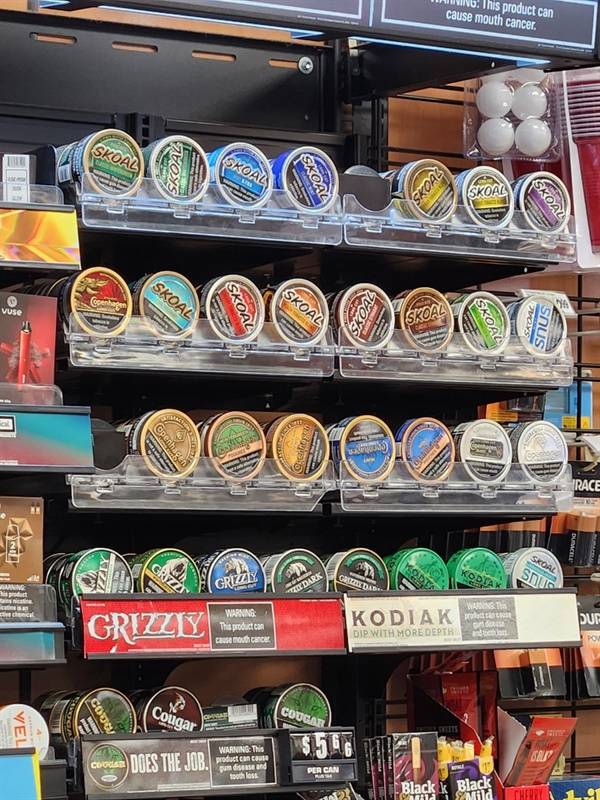 | ▲ 판매중인 무연 (씹는) 담배 편의점에서 쉽게 구매할 수 있으며 니코틴 파우치보다는 가격이 비싼 편이다. 담배 회사들은 미 프로야구 선수들에게 전략적으로 접근했고 씹는 담배는 야구 선수의 이미지가 되었다. 무연 담배 한켠에 니코틴파우치 매대도 자리를 잡아가고 있다. |
