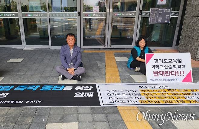 전국교직원노동조합 경기지부와 경기지역 교육·시민단체 등으로 구성된 특권교육저지경기공동대책위원회(아래 공대위)가 과학고 확대 반대를 요구하며 교육청 앞 노숙 농성에 돌입했다.