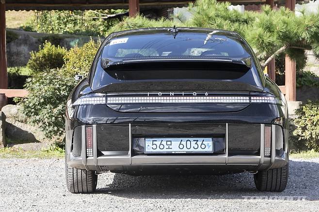 측면부는 유선형으로 자연스럽게 연마된 강돌과 같은 이미지로 오토 플러시 도어핸들이 적용됐다. 후면부 테일램프는 길게 뻗은 형태로 차체 폭을 강조한다. 일체형 스포일러가 탑재됐다. 아이오닉6의 트렁크 용량은 기본 401ℓ다. 전면 트렁크 용량은 AWD 기준 14.5ℓ다.
