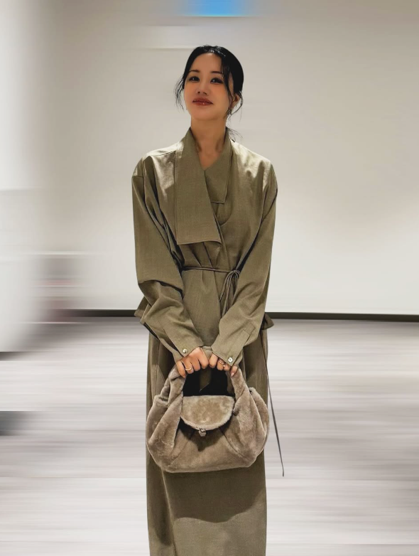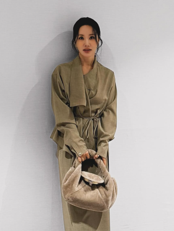 카키빛 셋업으로 그려낸 ‘성숙한 미’…퍼 백으로 포인트