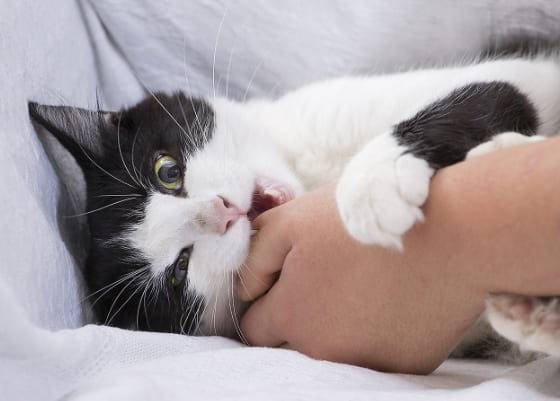 사냥 놀이를 하다가 너무 흥분하면 집사를 물 수도 있어요. 사냥감으로 인식한 상태이기 때문에, 이런 경우에는 즉시 놀이를 중단하고, 흥분을 가라앉힐 수 있도록 자리를 피하는 게 좋습니다.