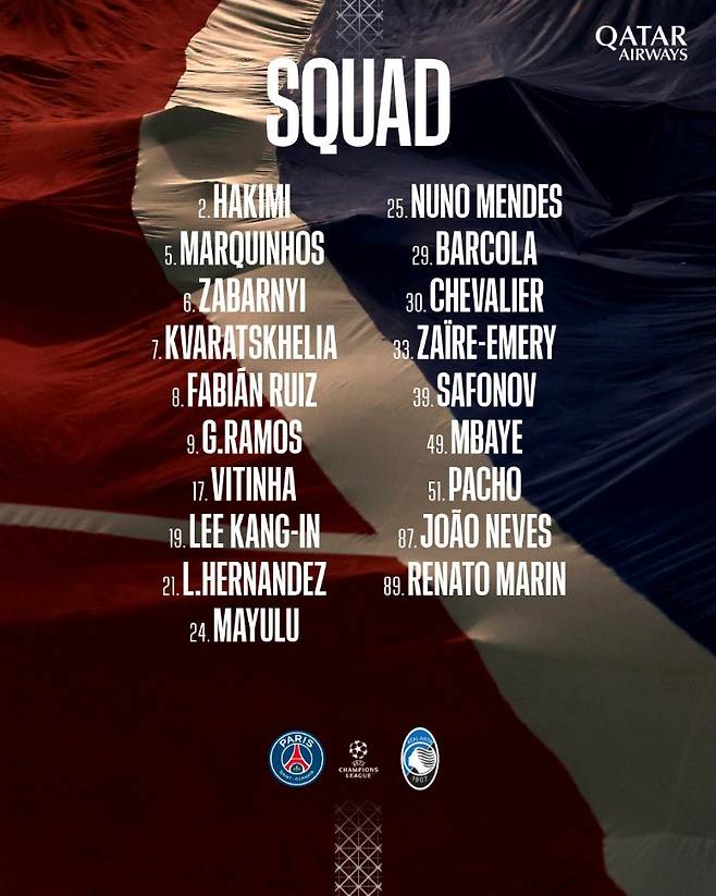 경기를 앞두고 PSG는 17일 구단 공식 사회관계망서비스(SNS) 계정을 통해 아탈란타전 소집 명단을 발표했다.