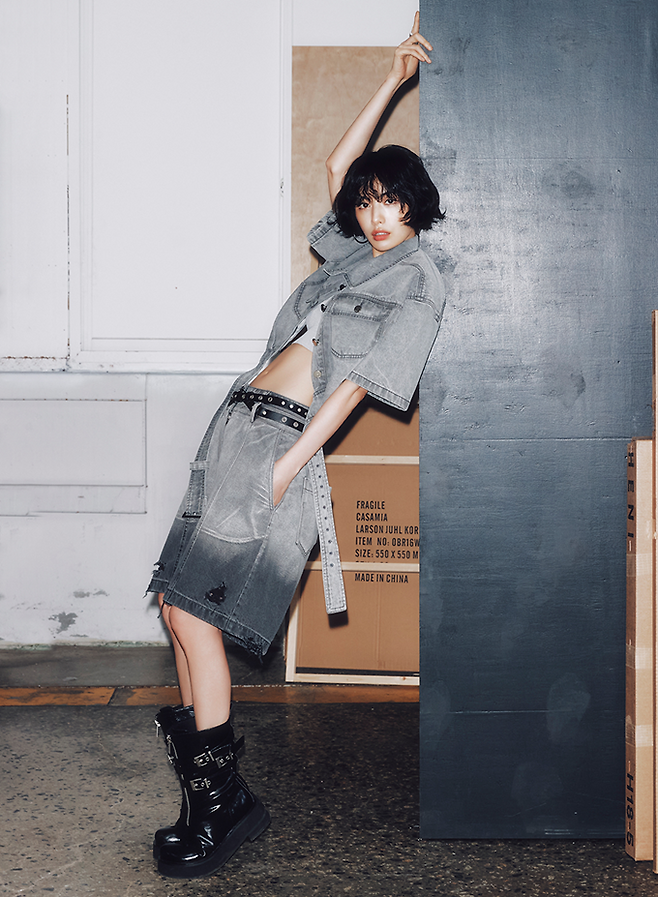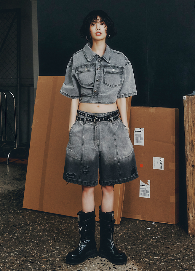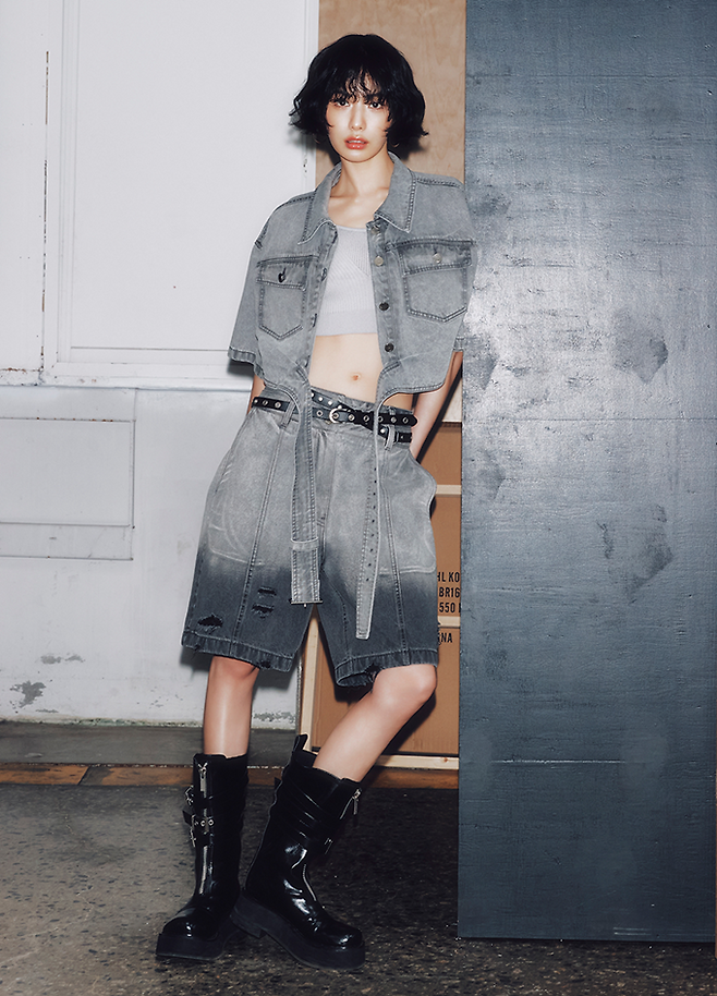 시선인터내셔널, 영 컨템포러리 '이비엠' 크롭 데님 재킷, 버뮤다 팬츠, 니트톱으로 완성한 데님 셋업룩
