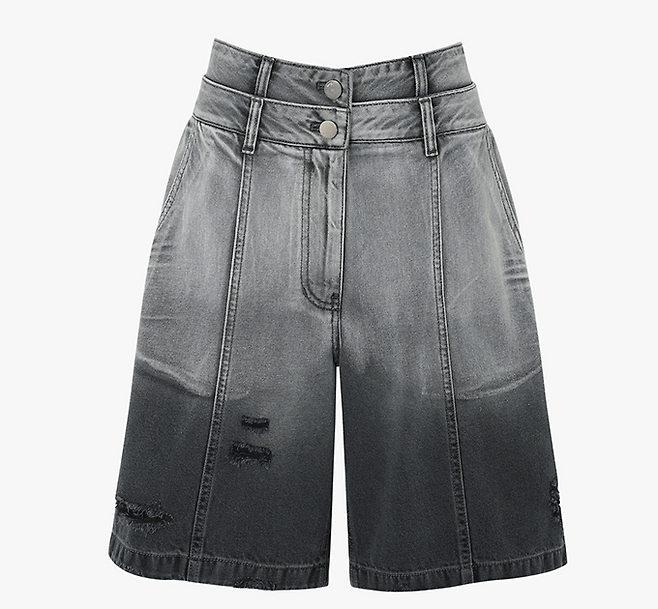 버뮤다 데님 팬츠는 와이드 실루엣과 레이어드 여밈 디테일, 그라데이션 워싱이 조화된 멋스러운 제품이다.