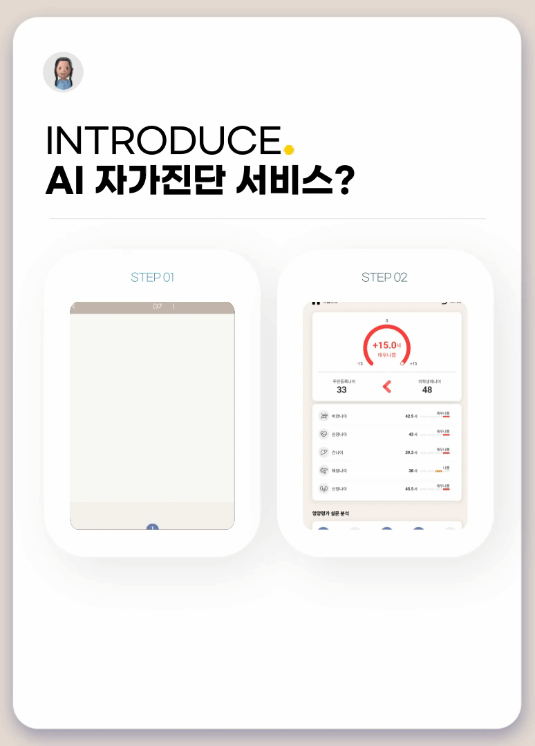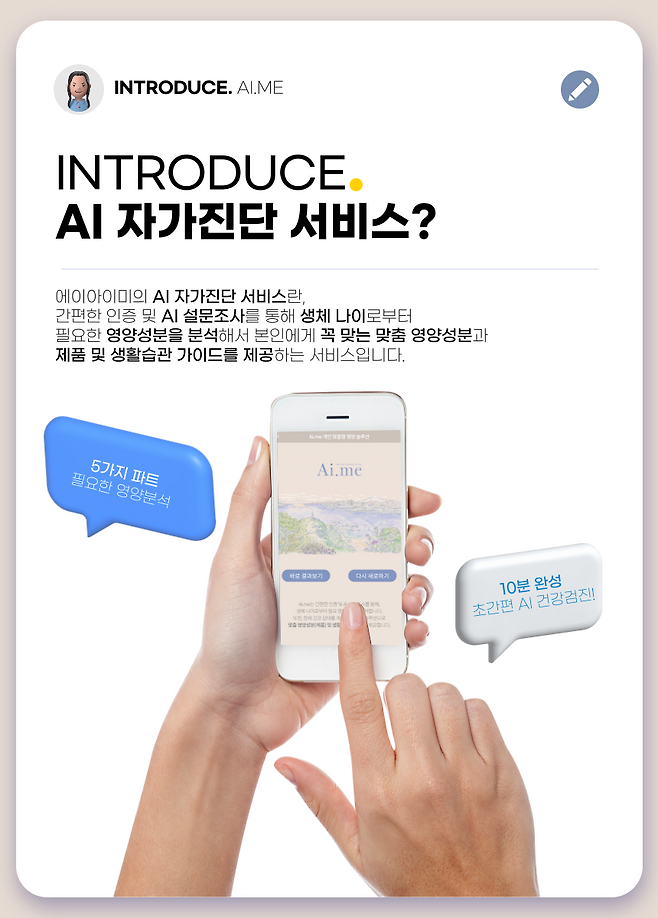 그런 사람들 위해 에이아이미는 간편한 인증과 설문을 통해 나에게 꼭 필요한 것만 섭취할 수 있도록 내 신체 전반의 상태를 진단해 주는 AI 자가진단 서비스를 제공한다.