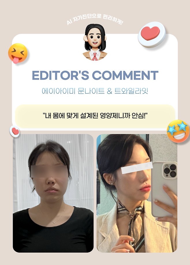 최근 업무로 인한 스트레스와 불면, 무기력과 체력부족을 회복하기 위해 하루 1알씩 충분한 물과 함께 에이아이미의 문나이트와 트와일라잇을 섭취하면서 이너뷰티에 집중했다. 다이어트와 피부관리도 자고로 기본을 지키는 자에게 승리의 컵을 내주는 법이니까.