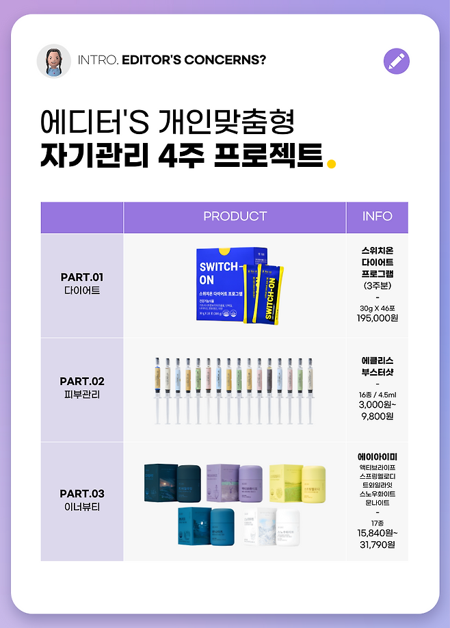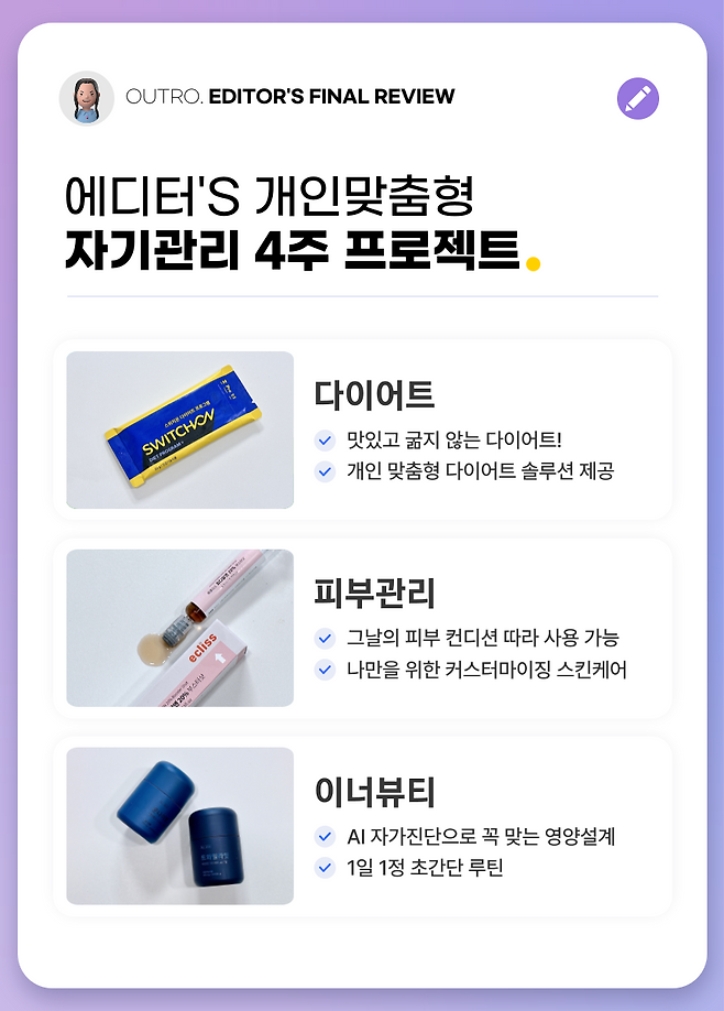이렇게 3주간 개인맞춤형 케어템을 총 3가지 파트로 나눠서 전략적으로 케어해봤다. 다이어트, 홈케어 피부관리, 이너뷰티 건강관리 영양제 케어.